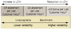 Over time, the Infracos need to meet progressively more difficult benchmarks of lower Lost Customer Hours (LCH), while the ambience benchmark remains constant in line with the expected delivery of station modernisations. Figure 8 shows how availability performance is incentivised, with payment deductions twice the amount of bonuses for the same amount of variation from benchmark.