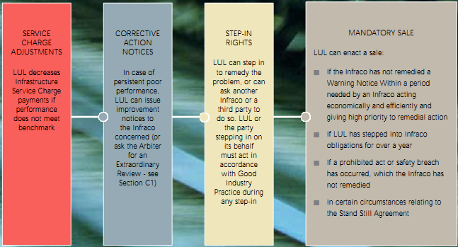 ■ LUL can issue corrective action notices for poor performance but although these require the Infraco to undertake - and fund - the necessary corrective action, they do not carry a direct financial penalty. However, the reputation of the Infracos is at stake and there may be adverse financial implications for them, for example with lenders, if they perform poorly. The contractual procedures in this situation are as follows: