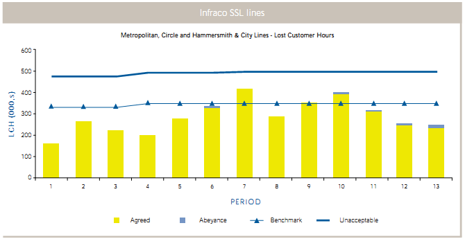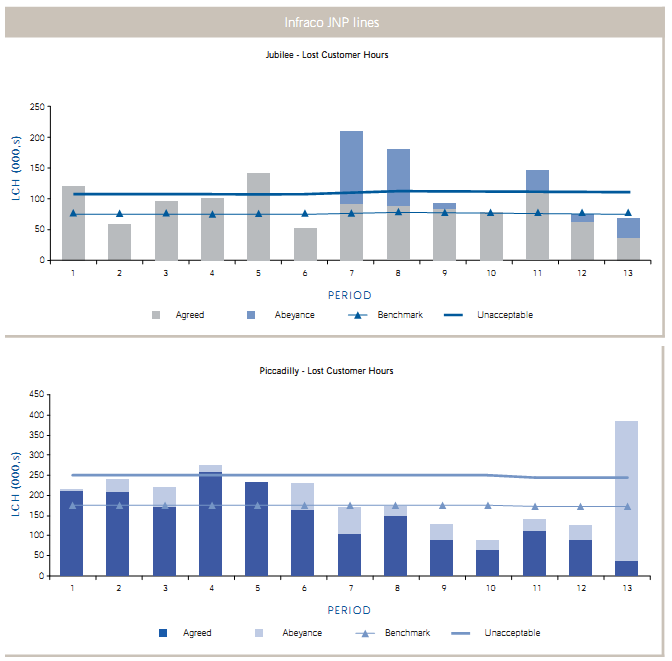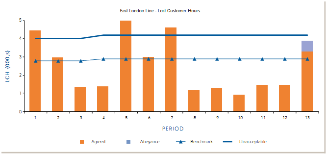 ■ The Piccadilly line performed between benchmark and unacceptable. A significant portion of poor performance was caused by axle box problems subsequently addressed on the rolling stock, although not all LCH resulting from this problem have yet been allocated - see case example 6. In recent periods, performance showed a downward trend, with better than benchmark performance at the end of the year.
