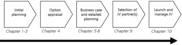 1.23 An overview of the typical key steps and actions for a public sector body to take in order to set up a JV is shown in Chart 1.A below. The Chapters in this Guidance have been set out broadly in the order of the steps described in Chart 1.A, albeit a number of the steps will require iterative consideration.
