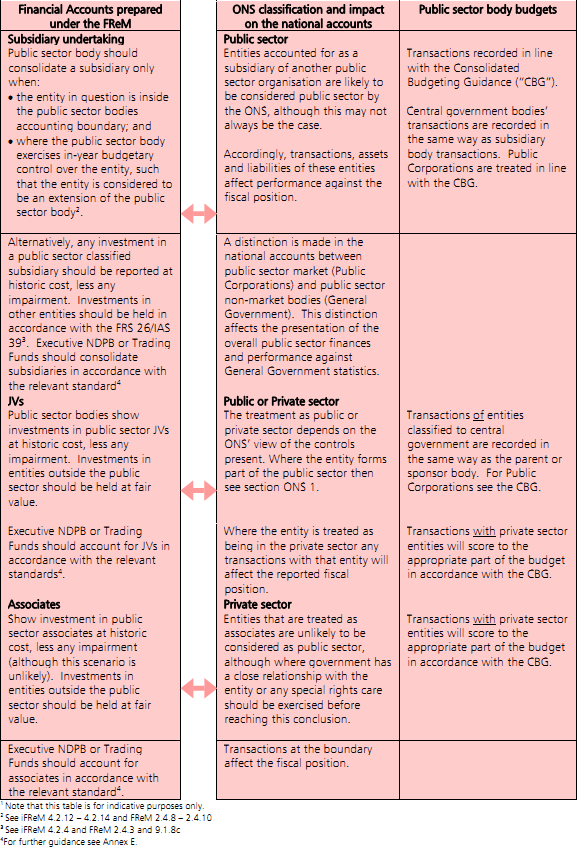 5.27 Table 5.B overleaf sets out the indicative relationship between the financial accounting determination of an entity, the likely ONS classification and the budgetary treatment as well as setting out the key issues to consider under each of the frameworks.