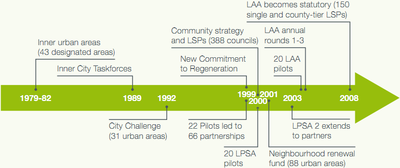 16 Government policy on joint working in the 1970s focused on specified areas and narrowly defined economic regeneration outcomes. This transformed during the 1990s into a wider focus on social and economic issues. From 2000, government attention shifted towards local objectives and joint working in all areas. Different councils have different experiences of joint working. The 43 areas designated in the 1978 Inner Urban Areas Act now have three decades' experience of joint working encouraged, incentivised, or mandated by government.