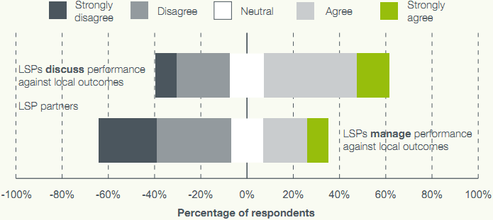 100 If LSPs are to 'review and performance manage progress against the priorities and targets agreed in the LAA and ensure delivery arrangements are in place' (Ref. 11), they will also need to challenge performance. While 75 per cent of partners agree that an LSP should challenge their performance against locally agreed outcomes, only 41 per cent say their LSP does.
