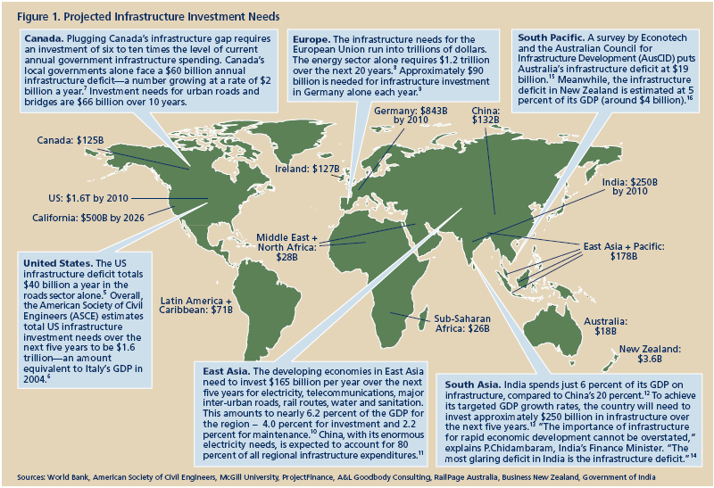 Citizens from New Delhi to New York confront the world’s glaring infrastructure deficit daily. From country to country, the large and growing gap between infrastructure needs and the resources governments have historically invested in meeting those needs is obvious everywhere: congested roads; bridges in need of repair; poorly maintained transit systems and recreational facilities; and deteriorated hospitals, schools and waste treatment facilities all in urgent need of rehabilitation and repair (see figure 1). Governments promise many new projects to close the gap, but often do not or cannot find the funding to follow through on their promises.