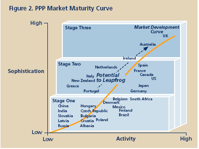 Instead, countries at earlier stages of PPP development could benefit from the opportunity to learn from the trailblazers who have moved to more advanced stages: the United Kingdom for schools, hospitals and defense facilities; Australia and Ireland for roads; and the Netherlands for social housing and urban regeneration. Latecomers to the PPP party can avoid some of the mistakes often made in earlier stages of maturity, such as the tendency to apply a one-size-fits-all model to all infrastructure projects. And they can adopt from the outset some of the more flexible, creative and tailored PPP approaches now being used in trailblazer countries. This approach would allow them to move up the PPP maturity curve more rapidly and leapfrog to more advanced stages of maturity.