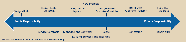 Public-Private Partnerships 101A public-private partnership, or PPP, refers to a contractual agreement formed between a government agency and a private sector entity that allows for greater private sector participation in the delivery of public infrastructure projects. In some countries involvement of private financing is what makes a project a PPP. PPPs are used around the world to build new and upgrade existing public facilities such as schools, hospitals, roads, waste and water treatment plants and prisons, among other things. Compared with traditional procurement models, the private sector assumes a greater role in the planning, financing, design, construction, operation, and maintenance of public facilities. Risk associated with the project is transferred to the party best positioned to manage it. Some of the most common PPP models are described below. Design-Build (DB): Under this model, the government contracts with a private partner to design and build a facility in accordance with the requirements set by the government. After completing the facility, the government assumes responsibility for operating and maintaining the facility. This method of procurement is also referred to as Build-Transfer (BT). Design-Build-Maintain (DBM): This model is similar to Design-Build except that the private sector also maintains the facility. The public sector retains responsibility for operations. Design-Build-Operate (DBO): Under this model, the private sector designs and builds a facility. Once the facility is completed, the title for the new facility is transferred to the public sector, while the private sector operates the facility for a specified period. This procurement model is also referred to as Build-Transfer-Operate (BTO). Design-Build-Operate-Maintain (DBOM): This model combines the responsibilities of design-build procurements with the operations and maintenance of a facility for a specified period by a private sector partner. At the end of that period, the operation of the facility is transferred back to the public sector. This method of procurement is also referred to as Build-Operate-Transfer (BOT). Build-Own-Operate-Transfer (BOOT): The government grants a franchise to a private partner to finance, design, build and operate a facility for a specific period of time. Ownership of the facility is transferred back to the public sector at the end of that period. Build-Own-Operate (BOO): The government grants the right to finance, design, build, operate and maintain a project to a private entity, which retains ownership of the project. The private entity is not required to transfer the facility back to the government. Design-Build-Finance-Operate/Maintain (DBFO, DBFM or DBFO/M): Under this model, the private sector designs, builds, finances, operates and/or maintains a new facility under a long-term lease. At the end of the lease term, the facility is transferred to the public sector. In some countries, DBFO/M covers both BOO and BOOT. PPPs can also be used for existing services and facilities in addition to new ones. Some of these models are described below. Service Contract: The government contracts with a private entity to provide services the government previously performed. Management Contract: A management contract differs from a service contract in that the private entity is responsible for all aspects of operations and maintenance of the facility under contract. Lease: The government grants a private entity a leasehold interest in an asset. The private partner operates and maintains the asset in accordance with the terms of the lease. Concession: The government grants a private entity exclusive rights to provide operate and maintain an asset over a long period of time in accordance with performance requirements set forth by the government. The public sector retains ownership of the original asset, while the private operator retains ownership over any improvements made during the concession period. Divestiture: The government transfers an asset, either in part or in full, to the private sector. Generally the government will include certain conditions with the sale of the asset to ensure that improvements are made and citizens continue to be served.