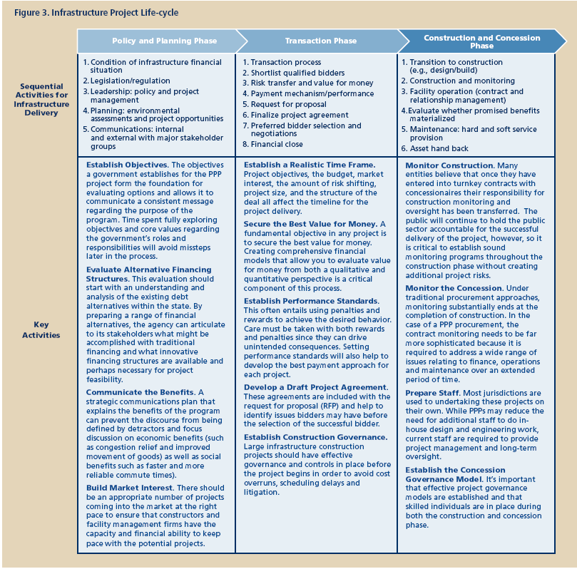 A life-cycle perspective helps governments understand how decisions made during different phases will affect the long-term success of the project. For example, the way a project is monitored will be determined largely by how much risk is transferred to the private sector during the transaction construction and concession phases. As shown in figure 3, there are three major phases for an infrastructure project under an innovative finance approach.