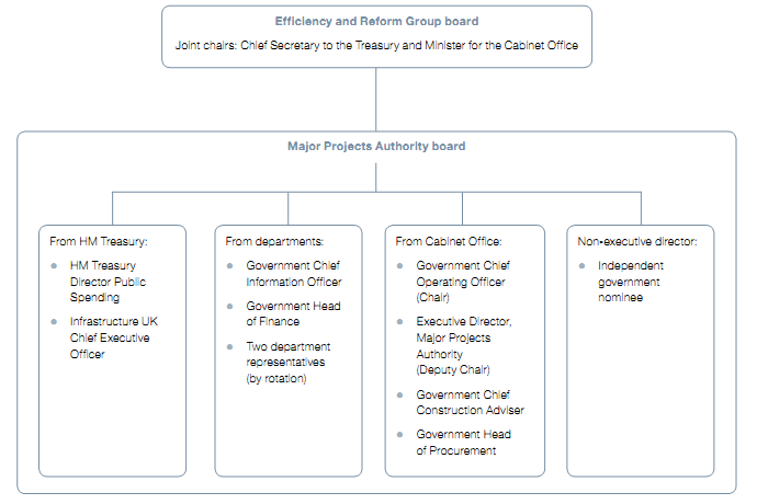 1.8 Government agreed with our assessment of the weaknesses in the central assurance system. It created the Major Projects Authority (the Authority) with the ambition of addressing the poor performance which has led to the failure of government projects in the past.4 The Authority, part of the Efficiency and Reform Group within the Cabinet Office, was established by a prime ministerial mandate in January 2011 and launched in March 2011. It is a partnership between Cabinet Office and HM Treasury, reporting jointly to the Chief Secretary to the Treasury and the Minister for the Cabinet Office, and incorporates representatives with a variety of interests across government (Figure 2).