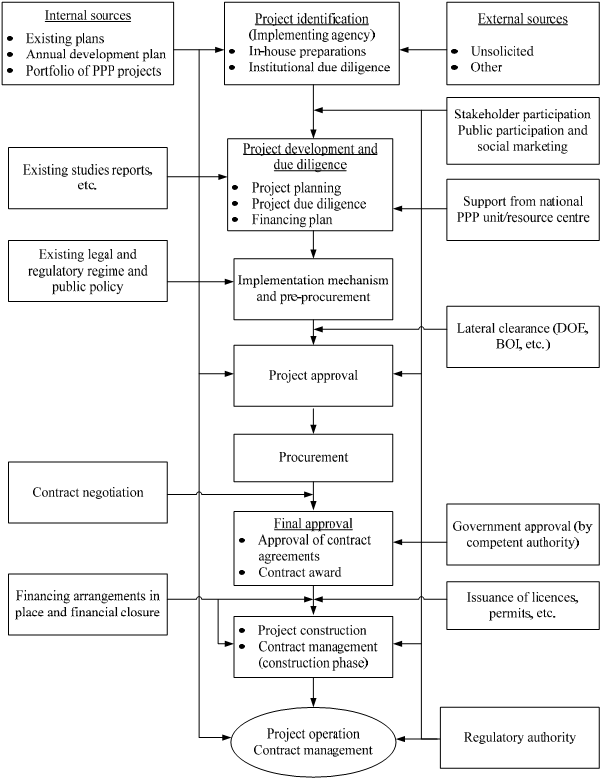 | Figure 1 shows the steps that are generally considered in a PPP project implementation process. More details on tasks at various stages of project development and implementation are provided in table 1. Clear definitions and procedures of various tasks and administrative approval from competent authorities at different stages of project implementation process are necessary in running a successful PPP programme. Streamlined administrative procedures reduce uncertainties at different stages of project development and approval and help to reduce the transaction cost7 of a PPP project. Annex I provides an example of the defined PPP project implementation process and tasks at each stage in the state of Victoria in Australia. | Steps in PPP project development and implementation |