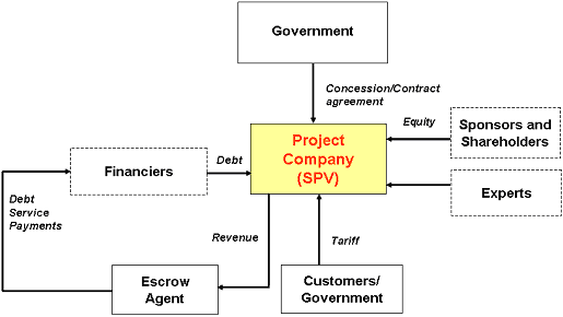 | A typical PPP structure can be quite complex involving contractual arrangements between a number of parties including the government, project sponsor, project operator, financiers, suppliers, contractors, engineers, third parties (such as an escrow agent8), and customers. The creation of a separate commercial venture called a Special Purpose/Project Vehicle (SPV) is a key feature of most PPPs. The SPV is a legal entity that undertakes a project and all contractual agreements between various parties are negotiated between themselves and the SPV. SPVs are also a preferred mode of PPP project implementation in limited or non-recourse situations, where the lenders rely on the project’s cash flow and security over its assets as the only means to repay debts. Figure 2 shows a simplified PPP structure. The actual structure of a PPP however, depends on the type of partnerships as may be seen in discussion presented later. | SPV and its advantages |