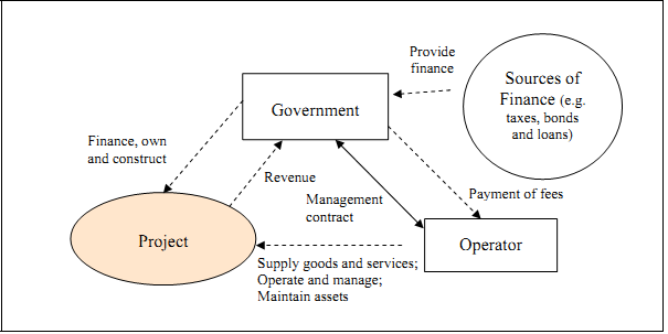 | A management contract is a contractual arrangement for the management of a part or whole of a public enterprise (for example, a specialized port terminal for container handling at a port or a utility) by the private sector. Management contracts allow private sector skills to be brought into service design and delivery, operational control, labour management and equipment procurement. However, the public sector retains the ownership of facility and equipment. The private sector is provided specified responsibilities concerning a service and is generally not asked to assume commercial risk. The private contractor is paid a fee to manage and operate services. Normally, the payment of such fees is performance-based. Usually, the contract period is short, typically two to five years.14 But longer period may be used for large and complex operational facilities such as a port or airport. Figure 4 shows typical structure of a management contract.15 | Basic features |