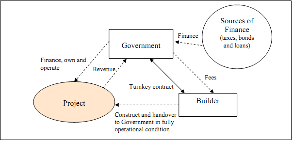 | Turnkey is a traditional public sector procurement model for infrastructure facilities. Generally, a private contractor is selected through a bidding process. The private contractor designs and builds a facility for a fixed fee, rate or total cost, which is one of the key criteria in selecting the winning bid. The contractor assumes risks involved in the design and construction phases. The scale of investment by the private sector is generally low and for a short-term. Typically, in this type of arrangement there is no strong incentive for early completion of a project. This type of private sector participation is also known as Design-Build. Figure 5 shows the typical structure of a turnkey contract. | Basic features |