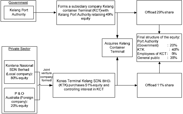 According to the privatization plan a new company called Klang Container Terminal (KCT) was established. Initially KCT was wholly-owned by the Port Authority. This was done to facilitate the issuance of shares by the new company, which could be sold to a private sector buyer. The Port Authority invited bids to sell 51 per cent shares of the newly formed company KCT. The rest 49 per cent was retained by the Port Authority. It was decided that once KCT was well established there would be a public offering to sell part of the shares held by the Government and the private buyer. According to the plan, after selling the shares through public offering, the distribution of equity held the shareholders would be as follows:
