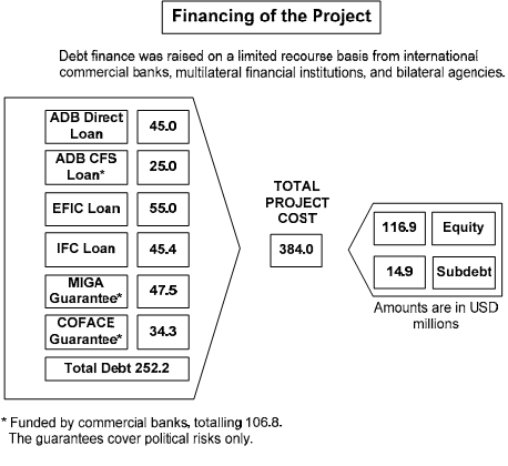 MNTC, the project company, is a joint venture of four companies namely, First Philippine Infrastructure Development Corporation, Philippine National Construction Corporation, Egis S.A. of France, and Leighton Asia Ltd. of Australia. The project had a value of US$ 384 million, of which the four companies together had a total equity contribution of US$ 116.9 million. The debt finance was raised on a limited recourse basis from international commercial banks, multilateral financing institutions and bilateral agencies. The Asian Development Bank, EFIC, IFC and commercial banks provided US$ 252.2 million as debt and the rest US$ 14.9 million came as subordinate date. The financing structure of the project is shown in figure 14. The debts provided by the commercial banks (US$ 106.8 million) were guaranteed under the credit guarantee programmes of the ADB, MIGA and Coface.