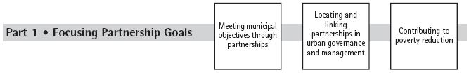 Part 1 considers what 'focusing a partnership' means. In order to consider PPPs in relation to the urban poor, a municipality needs first to clarify their objectives of improving services and the benefits that a partnership involving the private sector might bring, to consider the way the partnership will be developed and function as a part of city governance, and to consider the mechanisms that will ensure that the partnership contributes to poverty reduction.