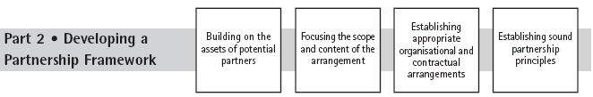 Part 2 is concerned with the nature of partnership arrangements. It considers these in terms of the actors that might be involved in the arrangement, the content of the arrangement, the existing vehicles for putting the arrangement in place, and the fundamental parameters underlying an effective partnership.