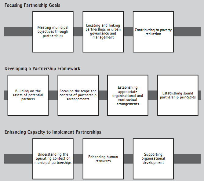 Current best practice provides a range of reforms intended to result in the more effective governance and management of cities. These reforms include, for instance, democratic processes, stakeholder participation, financial sustainability and cost recovery, corporatisation, human resource development, accountability and transparency, and so on. The process of developing private sector participation in urban infrastructure and services both influences and is influenced by this dynamic process of reform. Partnerships are not isolated 'projects' but primary aspects of shifting methods of urban governance and management. This element of the framework is introduced to locate the concept of PPPs within a broader understanding of how cities in developing countries are run, to consider where private sector participation fits in this process, and to establish the key linkages between sectors and municipal functions. One of the primary aspects of this discussion concerns the sectoral approach to private sector participation in the context of the multisectoral obligations of municipalities. Few cities have developed an integrated approach to partnerships that recognises the existence of other partnerships or the potential impacts of partnership development on other sectors.