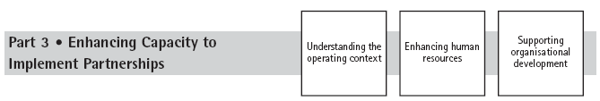 Part 3 is focused on the capacity required at the municipal level to bring all this about. In order for the municipality to take forward partnerships focused on the poor, it is necessary to not only consider what the ingredients are and who the players are, but what kind of capacity will lead them there. In essence, this means understanding the key steps in the process of initiating, developing and implementing a partnership. This includes: developing a better understanding of the factors that affect the capacity of the municipality to act; enhancing human resources; and supporting organisational and managerial change.