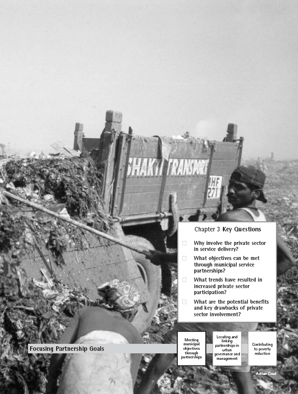 It would be useful to present a comprehensive range of the objectives and reasons for private sector participation given in the existing literature. The advocacy provided by the World Bank has led to a wealth of literature that asserts the benefits of private sector participation, disseminates experience, and analyses (mostly in economic terms) the experience of private sector participation in both network and non-network services. This body of information forms an important source for municipal capacity building and is frequently cited throughout this book. However, with notable exceptions,1 there is still little mention of the possible disadvantages and the potential areas of private sector failure, especially in relation to the poor. In the rush towards private sector solutions to service deficiencies, much of the documentation seems to lack a rationale, preferring instead to make definitive policy statements. Many promotional documents produced by donors mix problems with policies and solutions. Other widely available toolkits and guidelines produced for developing countries launch quickly into how private sector participation can be achieved, without providing any justification of why private sector participation may be necessary or desirable. For municipal officials venturing down this path for the first time, a process of justification and clarification is crucial not only to understand the benefits of involving the private sector, but also to highlight the problems that may need to be mitigated.