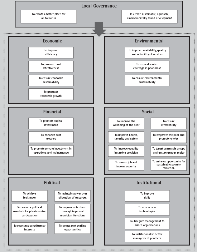 The description of municipal service problems can be quite complex and the perception of service problems can vary between stakeholders. Within basic service delivery (such as water supply, sanitation and solid waste services), various sector-specific factors, along with demand and supply constraints, often change the nature of the problem. Understanding the complexity of the problem is thus a keystone that leads to clarity in the definition of objectives and greater understanding of the benefits of the private sector. Yet many municipalities have a limited capacity for analysing and articulating physical and institutional problems, and many overlook the ways in which users experience service problems. This lack of skill ultimately affects decision-making and the development of appropriate solutions.