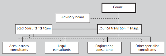 While the success of the process owed a great deal to the council's leadership and the flexible approach of the transition manager, the structure and approach adopted by the council had a number of clear advantages. The lead consultant's role was that of a true advisor to the transition manager. This person was involved in the detail of the issues, and in the development of ideas, and was responsible for driving the process. This resulted in much greater ownership of the solutions by the council. The lead consultants were engaged with flexible terms of reference that recognised that the scope and extent of services was difficult to define at the start. They were able to respond to events in a flexible and efficient way. In addition, sub-consultants were contracted directly to the council, but the management and coordination of consultants was shared between the transition manager and the lead consultants; and by procuring the sub-consultants individually, the council was able to select the best specialist firms for the tasks. This would not have been possible with a traditional consultancy approach, in which the client organisation must accept the team assembled by the winning consultant. | |