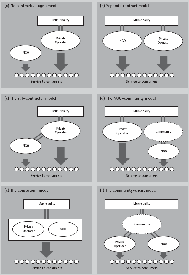 A second model (see Box 8.11(b)) creates a contractual relationship between the NGO and the municipality but retains a separation between the private sector and the NGO. Like the private sector, the NGO provides a service for some agreed remuneration.
