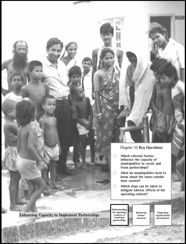 It is not possible to describe a perfect operating environment. The factors making up the environment and influencing the development of a service partnership in developing countries are mostly in a state of flux. Even where effective institutions and instruments are developed, the social, economic and political realities are changing. However, experiences in diverse contexts have highlighted a range of issues affecting the operating environments of local governments - issues that may severely affect their capacity to develop a partnership, and will help to determine the approach they adopt.