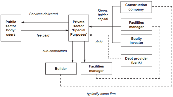 A PPP is a long-term arrangement between a public authority and a group of private sector firms, in which the latter is responsible for financing the design and build of new facilities, and then providing certain services within them once the construction works are completed. For example, in a hospital PPP, an NHS body will contract with the private sector to design, build and finance a new hospital. Once the hospital building is delivered, the private operator will maintain the facility and deliver a range of "non-core" services - such as catering and cleaning - for a period of 25-30 years.