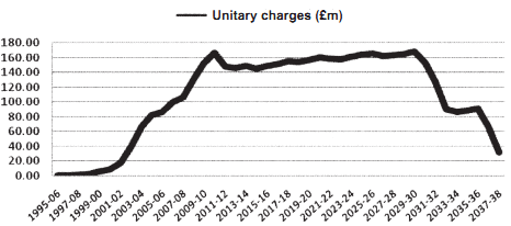 As explained in the introduction, the capital investment committed by the private sector has to be repaid with interest, along with payments for services. These unitary charges are paid by the NI Executive to the private sector over the 25-30 year length of PPP contracts. As noted, capital investment through PPP now equals £1.29 billion. Figure 3 (below) plots the profile of the £4.7 billion of unitary charges (in nominal terms) that accrue to the 35 contracts signed by March 2008. These payments rise from £1.5 million in 1997-08 to reach a peak of £167 million in 2010-11.