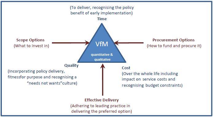 Value for money, as defined, includes the traditional components of time, cost and quality; and in considering alternative options, the broad classes of scope options and procurement / funding options need to be considered. The final component of value is effective delivery of the preferred option as illustrated below: