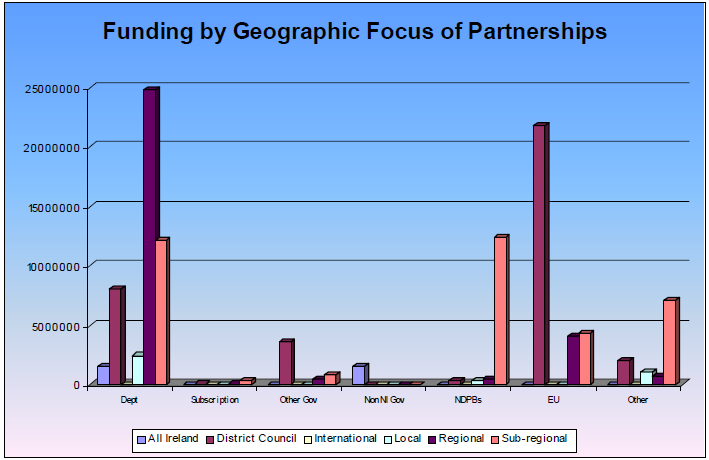 3.22 If we consider only those partnerships operating within Northern Ireland or on a cross-border basis, it is clear that the NICS Departments are the largest funders of partnership working in Northern Ireland. The greater proportion of funds, some 75%, allocated by Departments to Partnership working are allocated to partnerships working at a regional or sub-regional level (figure 4)21. This reflects the administrative boundaries of both NICS Departments and their executive agencies, but may also be accounted for by the requirement that bodies or programmes must be regional in order to access funding from Departments.