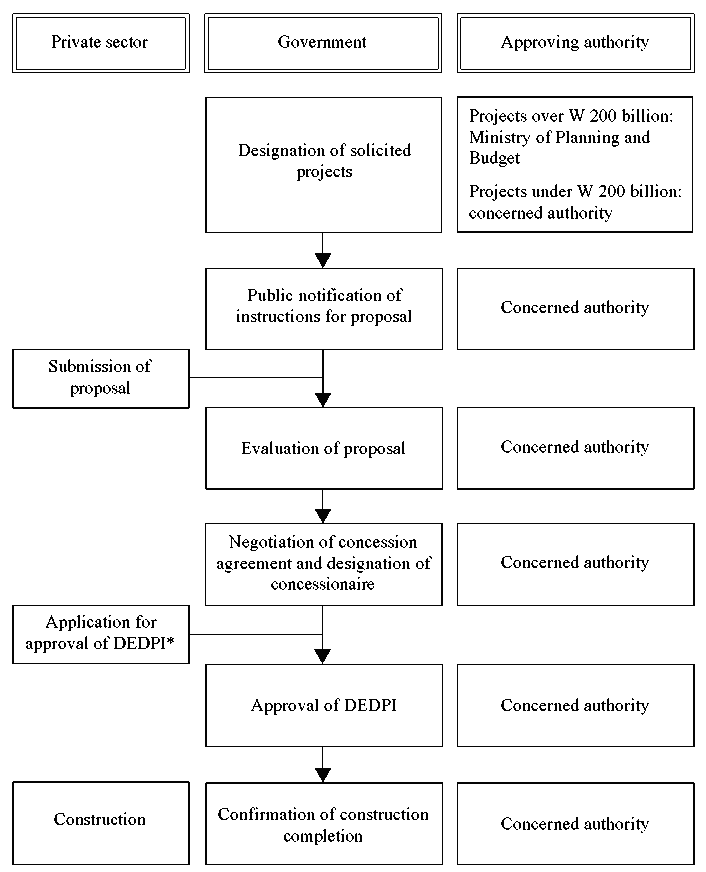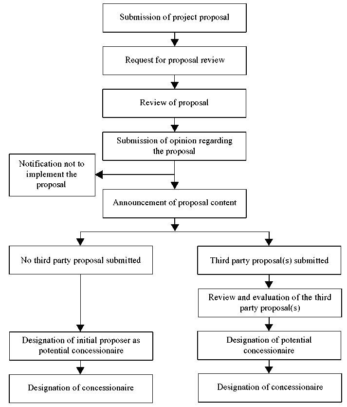 The Ministry of Planning and Budget, the concerned authorities and PICKO are involved in the selection of investment projects, evaluation of proposals and negotiation of concession agreements. The concerned authority (for example, the Ministry of Construction and Transportation in the case of transport projects) undertakes the initial activities for project development. The concerned authority is also responsible for approval of the engineering plan and confirmation of project completion.