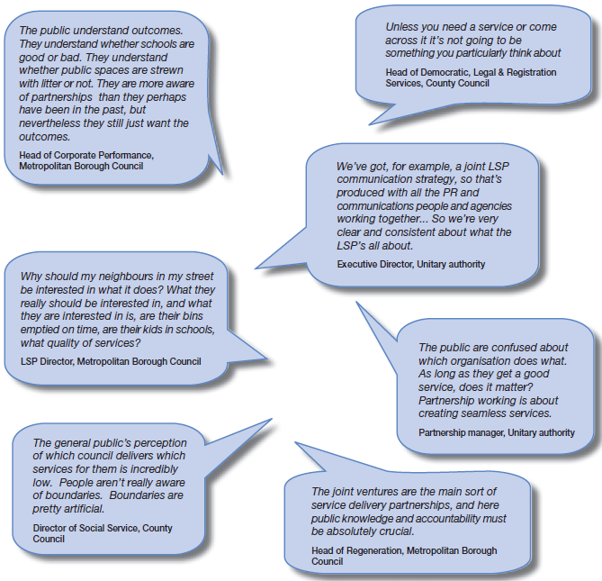 123 The formation of a partnership will not automatically produce better mechanisms for engaging with hard-to-reach communities than those that corporate bodies have established already. Many partnerships find that the same community representatives come forward.
