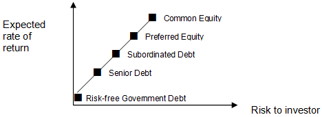 The capital structure of a project is not static and different sources can be used at different times during the project cycle. Furthermore, different sources of capital have different characteristics and a different risk/return profile based on their claim to assets. As seen in Figure 2 - 1, debt capital is 'cheaper' than equity as it is less risky than equity due to the fact that debt holders have a prior claim to revenue and assets and debt financing has covenants governing some of management's actions.