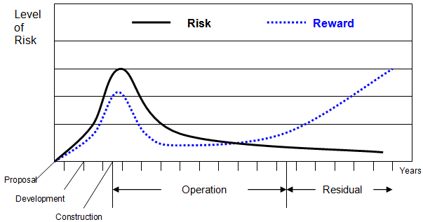 Figure 2 - 2 highlights the relationship between risk and return during the project phase. The highest level of risk exists during the construction phase of a project when construction delays and cost overruns can have serious consequences to a projects success. It is during this phase that investors require the highest return on their capital to compensate for the risk, thus the higher cost of capital. Once construction is over and the cash flow from operations has begun, project risks drop off substantially and it is possible for sponsors to refinance at a much lower cost.
