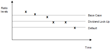 Though three coverage ratios have been discussed, many financiers will usually only focus on the DSCR and set three levels - base case, dividend lock-up, and default (see Figure 3 - 3) - to monitor a project. Coverage ratios above the base case and between the base case and dividend lock-up level are usually not a concern for lenders, though they will generally watch for trends. Once a coverage ratio falls below the dividend lock-up level, equity holders will be restricted from withdrawing funds to pay dividends until the ratios are at or above the base case level. If the ratios continue to fall towards the default level, lenders may take a more active approach in their dealing with management as they seek to better understand and rectify the downward trend in order to prevent a default35.