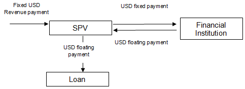 Interest rate swaps can be used to mitigate risks that can occur when an interest payment mismatch occurs. For example, if a project is financed based on a floating rate, as are many long-term financings, but the revenues are based on a fixed revenue stream the project, or SPV, is exposed to interest rate volatility. The SPV can enter into an interest rate swap, where it pays a fixed payment rate to a financial institution and in exchange receives a payment based on a floating rate. The diagram below shows the cash flows associated with such swaps. Since the company's debt service on its floating-rate loan is matched by the floating-rate cash flow received from financial institution under the swap, the company is left with a fixed-rate obligation. As a result, the interest rate swap has enabled the SPV to eliminate the risk caused by any interest rate volatility and effectively achieved fixed-rate funding for the project.