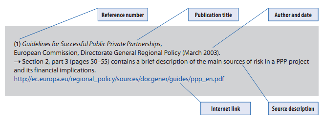 | All sources have a reference number to guide the reader to further information about the issue discussed in the text. This is done by using the symbol ">" next to the relevant reference number. Most sources relate to existing PPP guidelines or public policy material which can be accessed via the internet. In those cases, the references include the internet link address, as shown above. For publications, such as printed books, or other published material that cannot be accessed via the internet, the source description includes the ISBN details. For information: EPEC Team