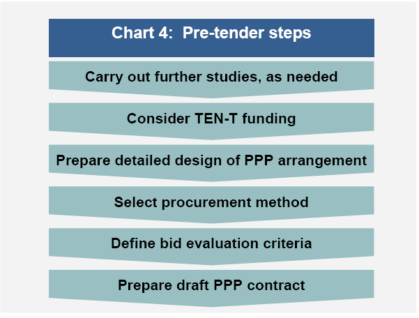 Some steps of the PPP cycle may not proceed in the rigid chronological order as Chart 4 implies, and there are often overlaps. For example, the final tasks of detailed PPP design preparation may continue during the later prequalification exercise. This will often be the most efficient way for the advisers to proceed.