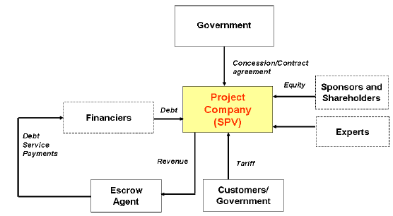 A typical PPP structure can be quite complex involving contractual arrangements between a number of parties, including the government, project sponsor, project operator, financiers, suppliers, contractors, engineers, third parties (such as an escrow agent5), and customers.