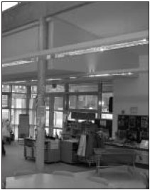 | Poor daylight and summertime environment. BRE noted that 'no school was visited which did not have the vast majority of its artificial lighting switched on'. For example, in one PFI school low window height severely limited daylight penetration to less than 15 per cent of the school hall width. The occupants' solution was to leave artificial lighting on all day. In the summer, hot air collected at ceiling level and could not escape. The ceiling then became a large radiator and added to discomfort from overheat. One way to avoid both problems would have been to ensure that there were high level opening windows. A second PFI school was, by contrast, one of the best schools for quality of daylight, which was adequately and uniformly distributed throughout the classrooms by clerestory lights. The latter were positioned to bounce light off the back wall of the classroom (as shown in the photograph). Source: BRE |