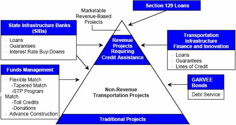 Over the last several years, interest in pursuing public-private partnerships has reemerged. The FHWA and FTA have undertaken a number of initiatives to explore the efficacy of public-private partnerships. Included in these initiatives are a number of Federal financing tools, as well as innovative contracting and management techniques. Some of these initiatives were developed within FHWA and FTA and others were developed pursuant to legislative direction. Figure 2.3 depicts these tools as a pyramid with the market-based projects appearing at the top of the pyramid (since there are fewer of these types of projects) and traditional, non-revenue transportation appearing at the bottom part of the pyramid, since most surface transportation projects fall into this category.