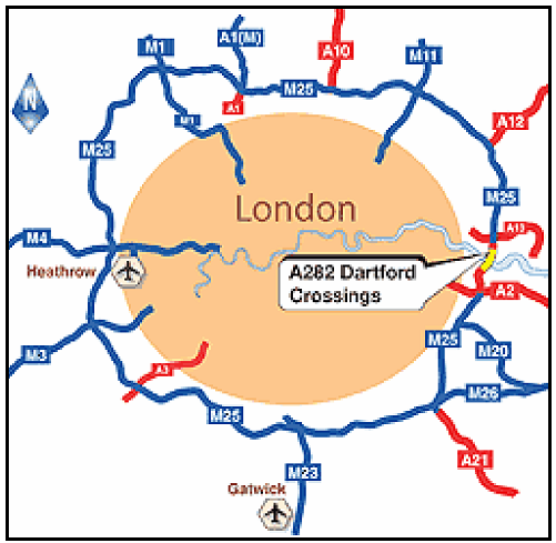 When the M25 orbital motorway around London was completed in 1986, the two Dartford tunnels provided a vital link in the national road network. Traffic on the roadway soon exceeded the maximum designed capacity of 65,000 vehicles per day on average, and forecasts predicted annual throughput in excess of 40 million vehicles. A new toll bridge at Dartford was therefore required to provide needed additional capacity along the M25 motorway to the two existing tolled tunnels, one of which opened in 1963 and the second in 1980. Exhibit 3.5 below presents a site map of the location of the bridge relative to the surrounding highway network.