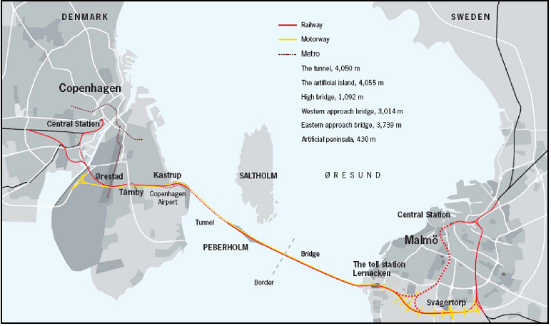 The Øresund Bridge (previously known as the Øresund Fixed Link) is a 16 kilometer (10 mile) link carrying both highway and railroad traffic across the Øresund Sound between Copenhagen, Denmark, and Malmö, Sweden. The link includes a four kilometer immersed tunnel; an eight kilometer, two-deck bridge; and a four kilometer artificial island (called Peberholm) where the traffic transitions between the tunnel and the bridge. The bridge itself is comprised of a three kilometer western approach and a four kilometer eastern approach joined by a one kilometer cable-stayed bridge. Exhibit 4.6 provides an area-wide site map for the project.