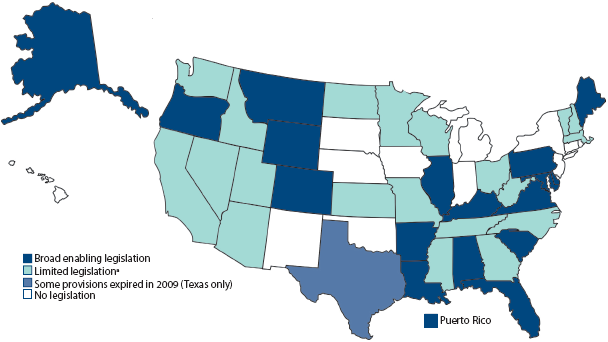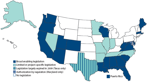 PPP legislation first was enacted more than 20 years ago in California (AB 680, 1989); a few years later, Virginia adopted its comprehensive Public-Private Transportation Act (1995). The number of states with PPP enabling statutes continues to grow. As of October 2010, 29 states and Puerto Rico had enacted laws authorizing PPPs for highway and bridge projects (see Appendix B and Figure 6)98 and 38 states and Puerto Rico had specifically authorized design-build approaches (see Appendix E and Figure 7).99 Model PPP and procurement legislation also has been developed.100