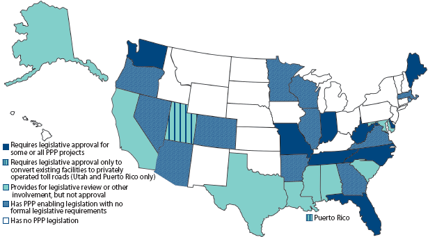 As of October 2010, Delaware, Florida, Indiana, Maine, Missouri, North Carolina, Tennessee, Washington and West Virginia required that at least some individual PPP projects be approved by the state legislature (see Appendix B and Figure 8). Of those, North Carolina required approval only for PPPs other than the five pilot projects listed in its statute, and Washington only for those PPP projects financed by tolls or other equivalent funding sources. In addition, Utah and Puerto Rico required legislative approval for converting existing facilities to privately operated toll roads. As another approach, at least eight states statutorily provided for some kind of legislative review but not approval of PPP projects.