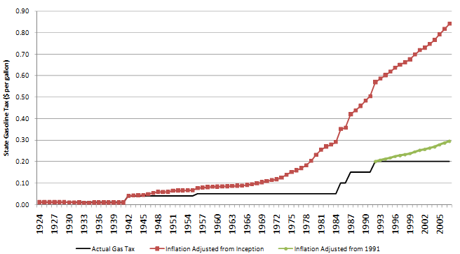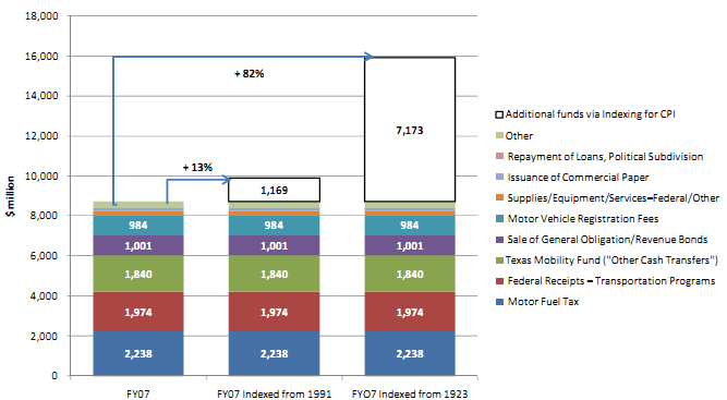 Another option is to index the tax to inflation. Like most other states, Texas does not currently do this, and the purchasing power of the motor fuels tax declines each year.37 Using the CPI, the 20 cents per gallon tax in 1991 translates into approximately 14 cents per gallon of purchasing power today.