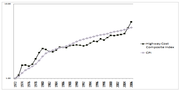 41 The Federal Highway Cost Composite Index includes costs for Excavation, Portland Cement, Bituminous Concrete, Reinforcing Steel, Structural Steel and Structural Concrete (source: Federal Highway Administration, "Price Trends for Federal-Aid Highway Construction"). TxDOT's Texas Highway Cost Index presents a similar picture.