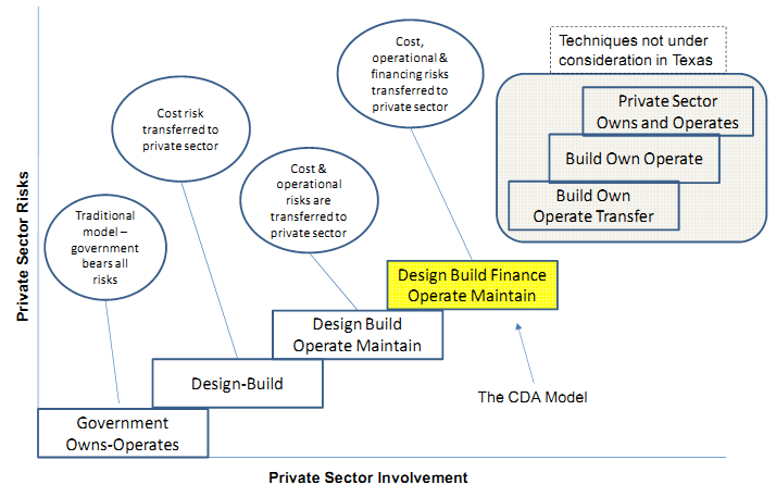 Texas has a long history of private sector involvement in building and maintaining our state's highways. The public's relationship with the private sector need not be "all or nothing." Rather, it is more accurate to think of private participation as a continuum of ways to include the private sector ingenuity and capital, all while maintaining full public control and oversight.