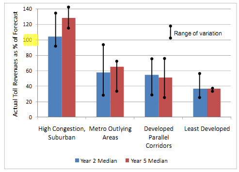 "High Congestion Suburban" toll roads (n=3) - a category that included the NTTA's George Bush Turnpike - were the most reliable performers.98 "Metro Outlying Areas" (n=7)99 and "Developed Parallel Corridors" (n=5) - a category that contained HCTRA's Sam Houston and Hardy toll roads - had a median performance of around 50 percent.100